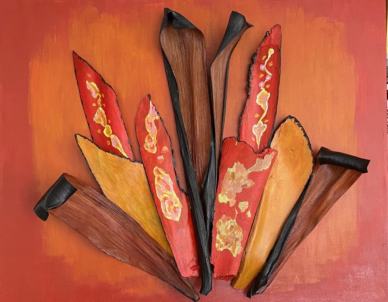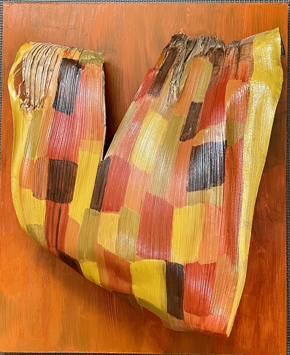 Good Ideas Enter the World | 2022, palm bark, acrylic paint, wood board, 24 × 18 inches