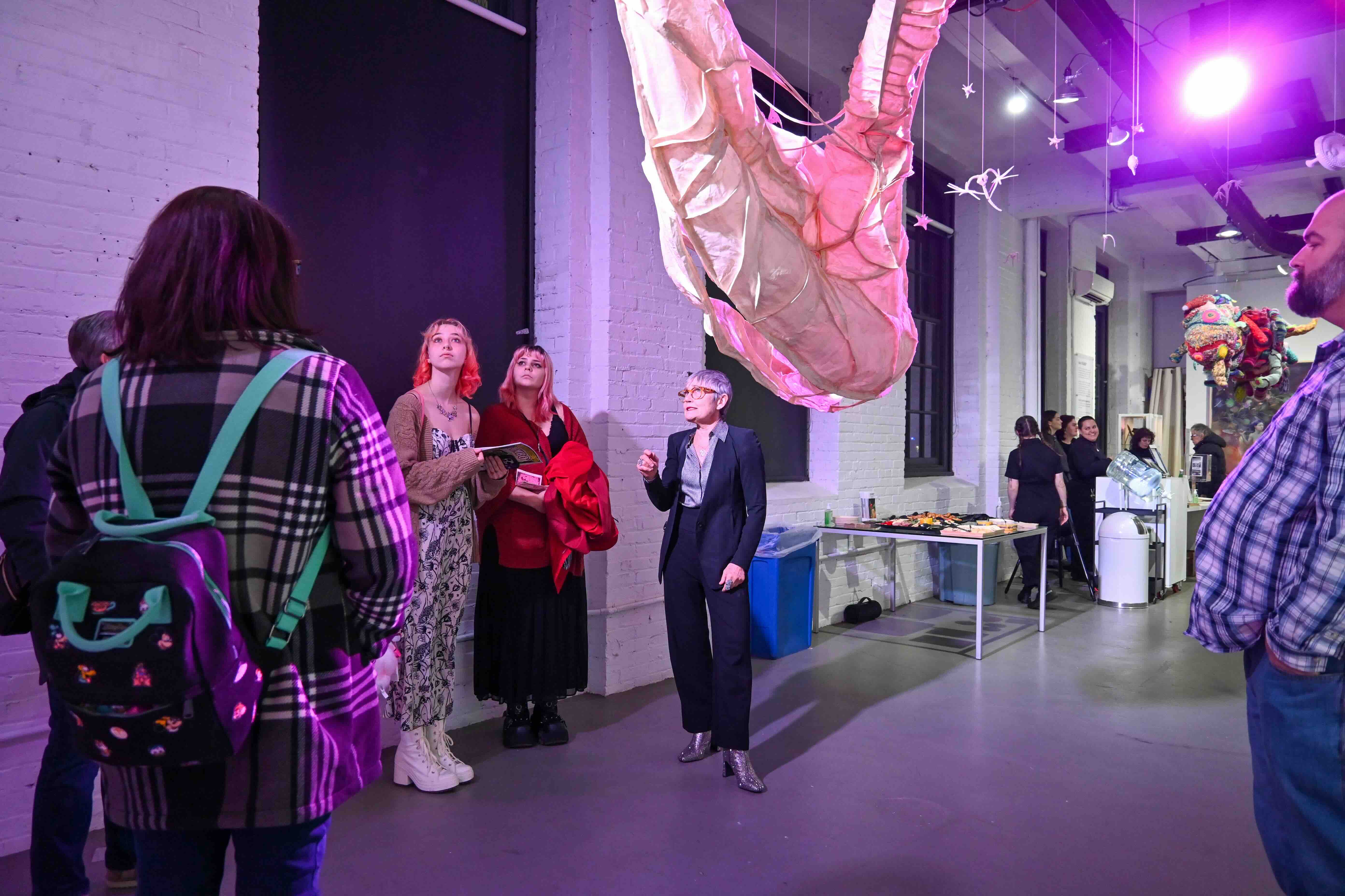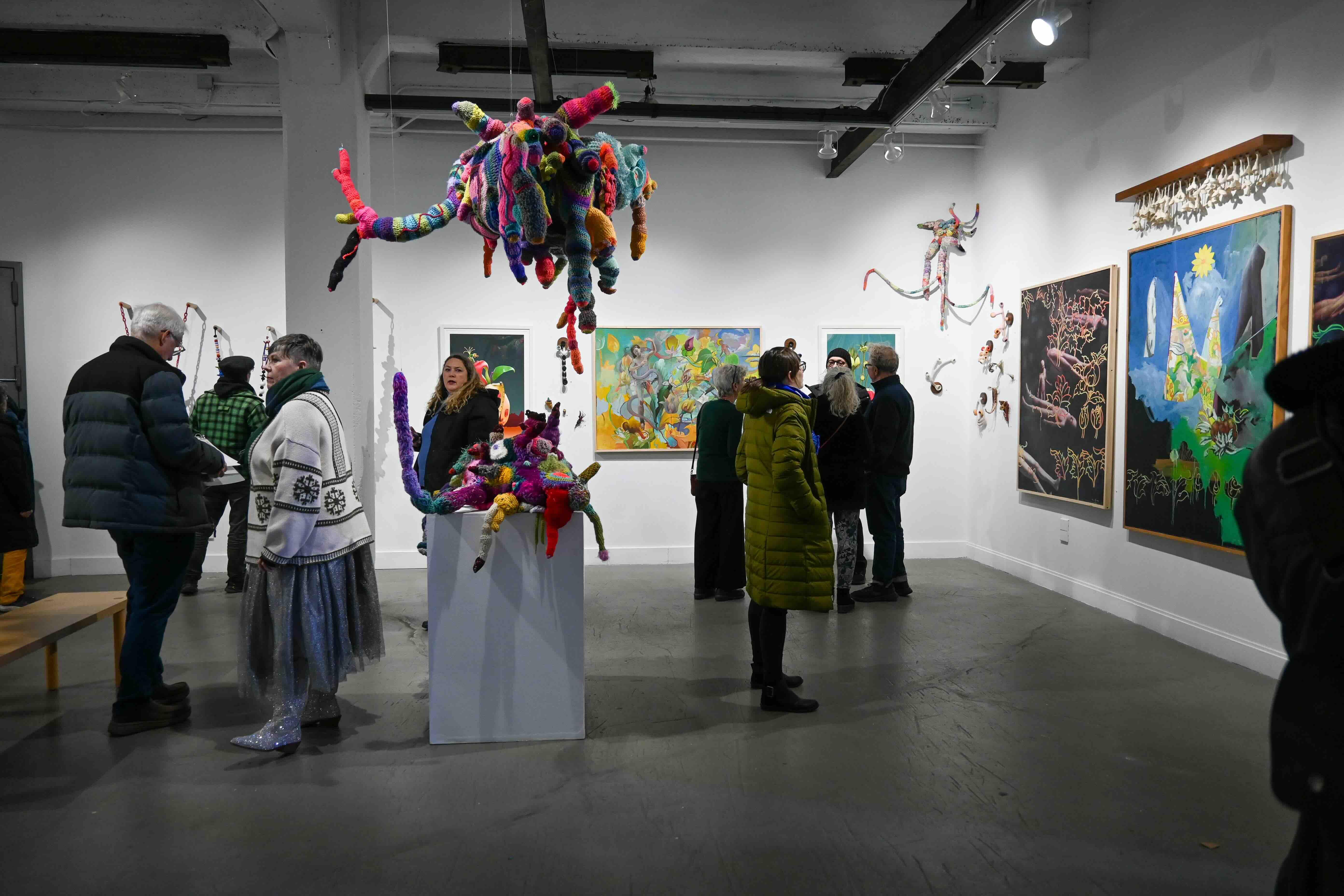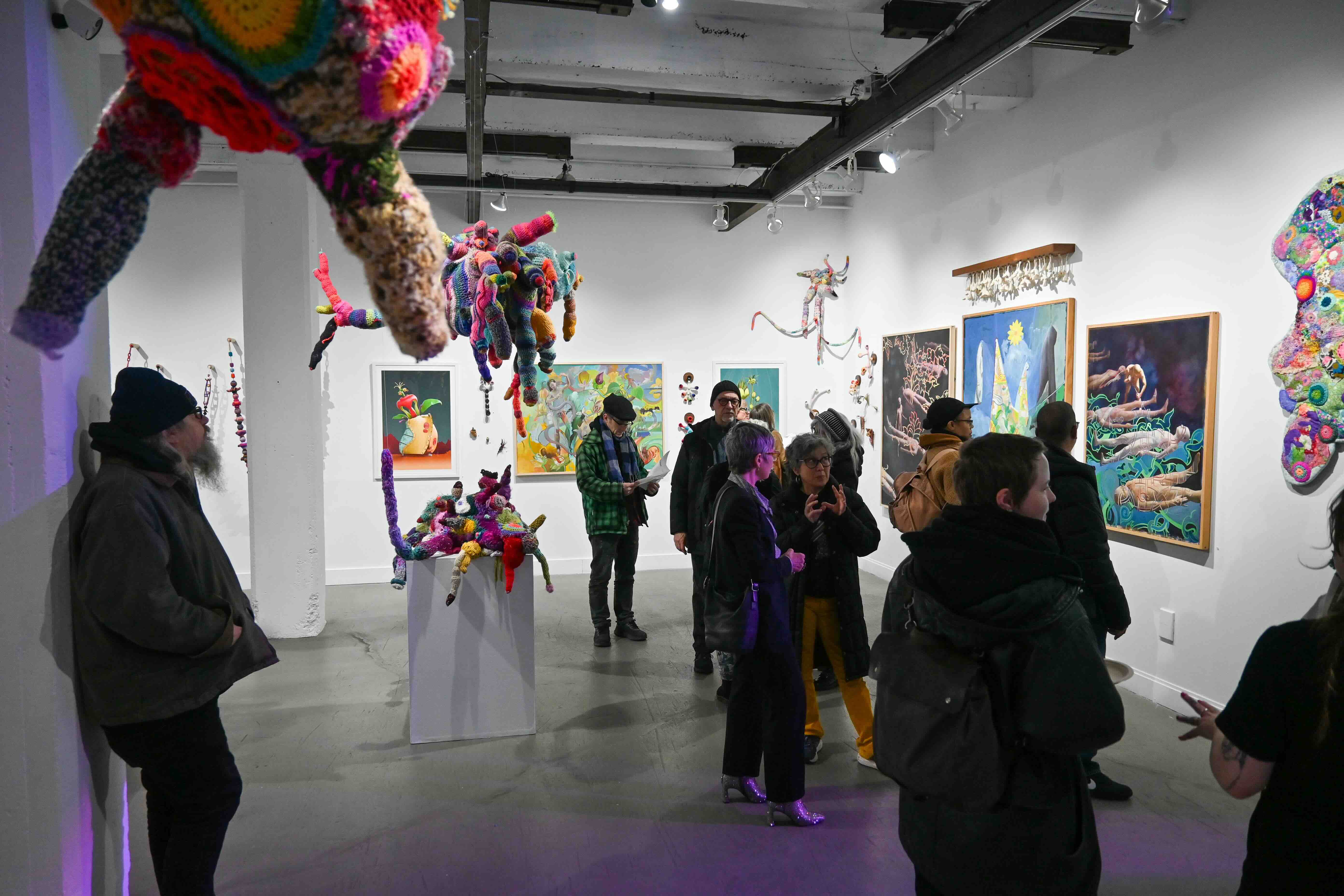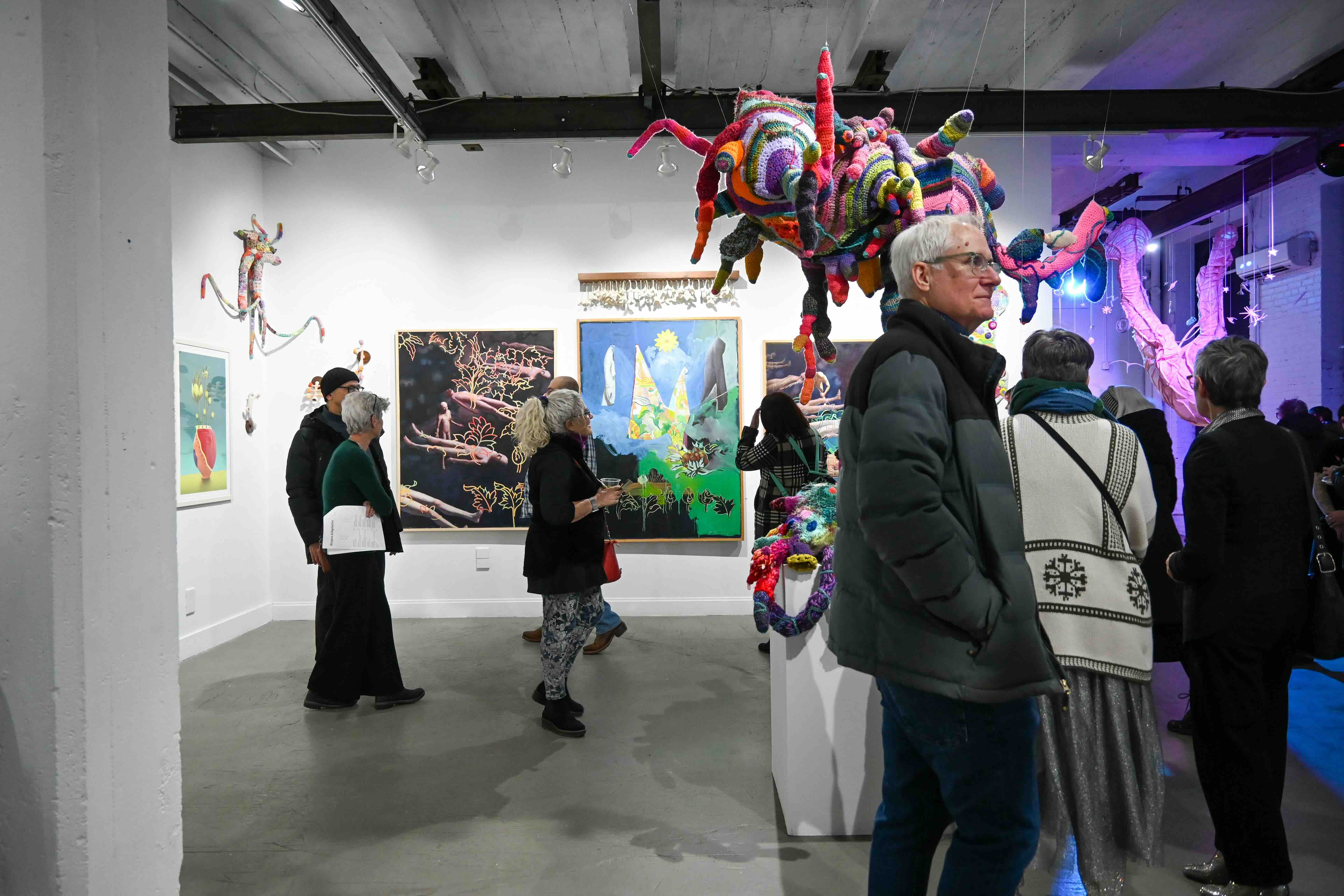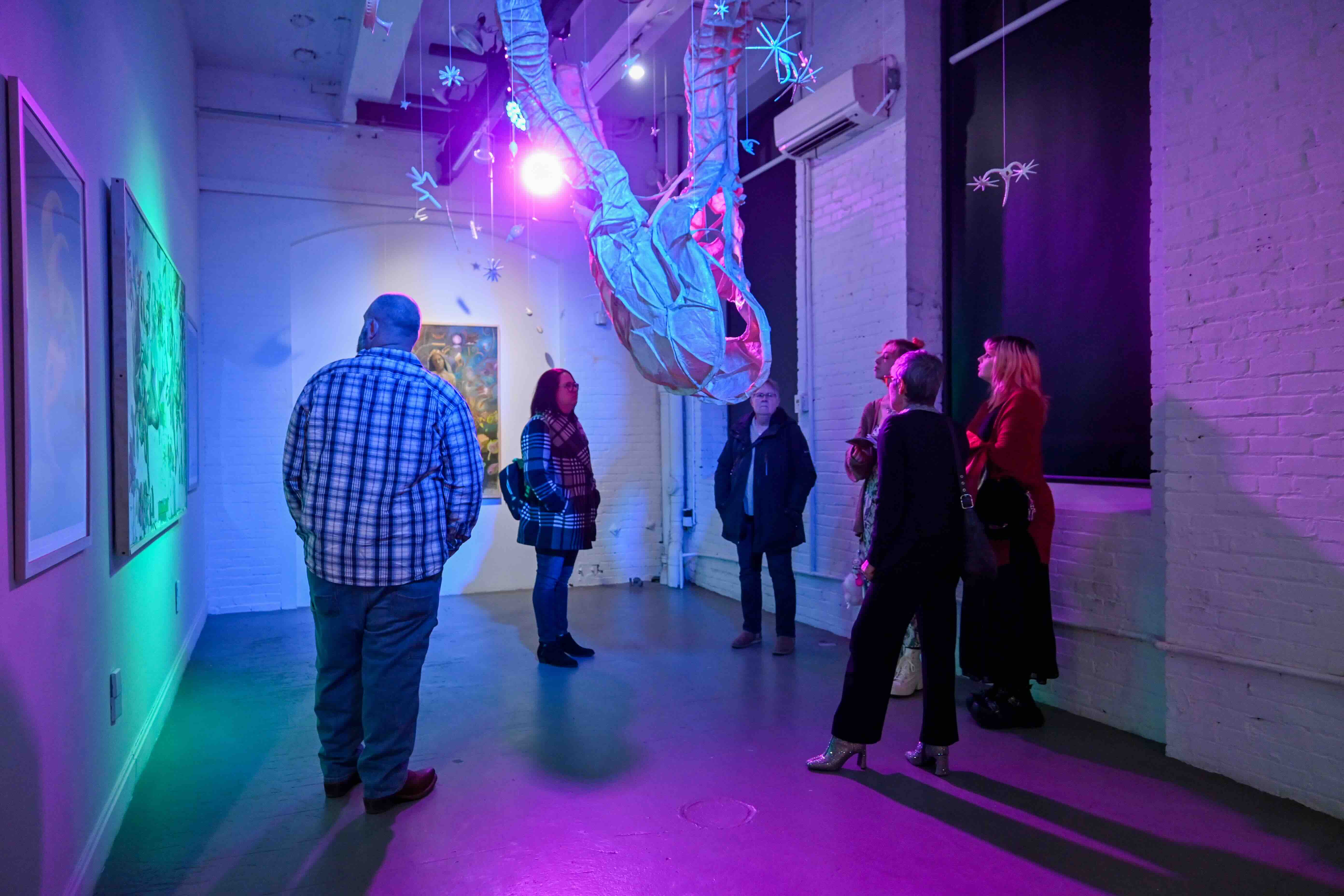 In Atopos Adaptation, pieces are displayed in a non-traditional and perhaps unexpected style. Rather than sculptures placed on pedestals, they are suspended from the ceiling and arranged in complementary disarray surrounding the 2-dimensional works. The viewer is encouraged to explore the relationships between the pieces just as much as observing the works as individual objects. Through this exploration, we aim to create symbiotic relationships between the work and the walls, referencing those found in nature. Therefore, the art is re-contextualized in our white-cube space as forms growing in the room as opposed to work placed on display.