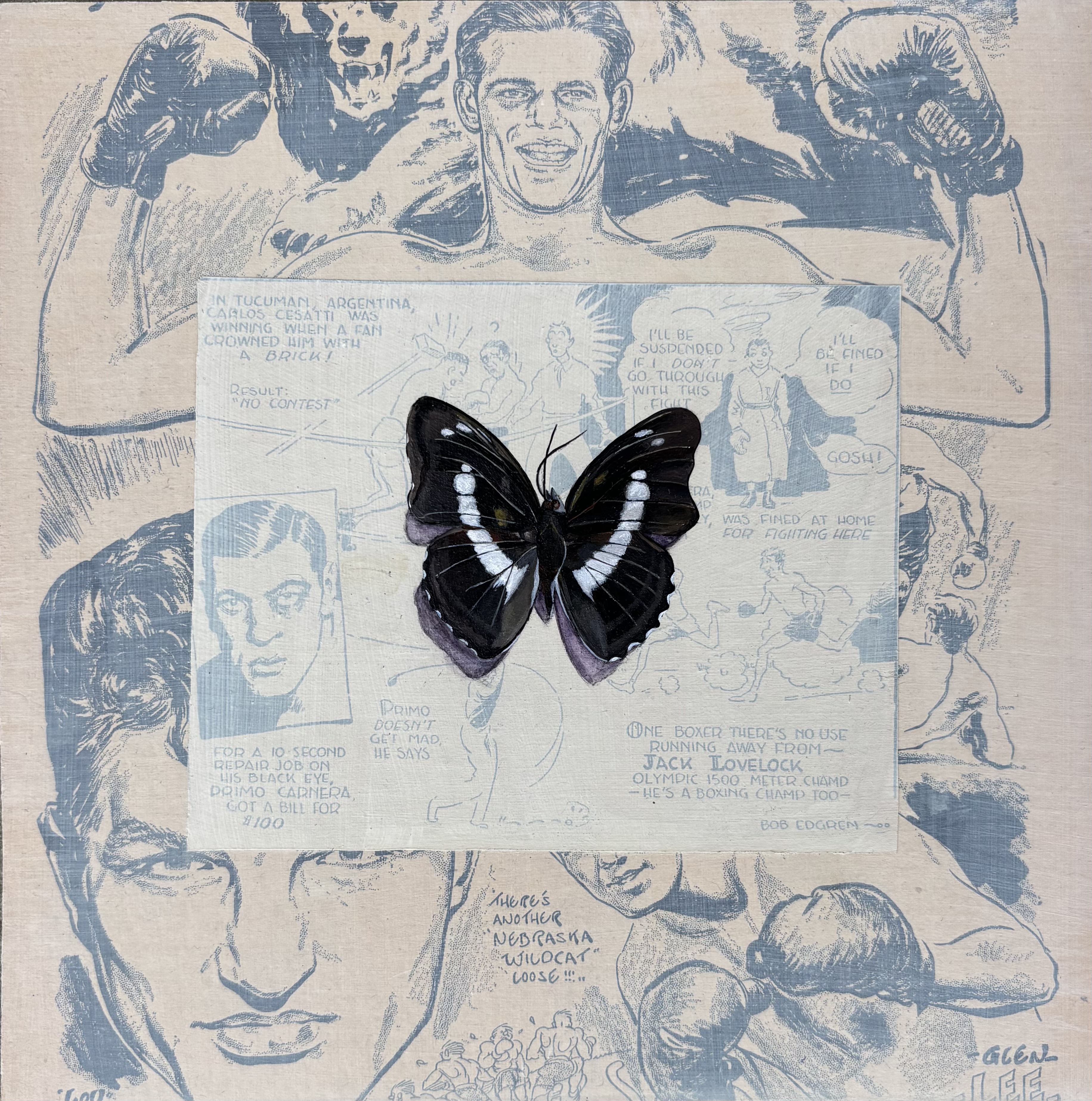 The collage pieces come from a set of 1920s Ring Magazine. I purchased them on eBay. I don’t always incorporate collage, but when I do eBay and thrift stores are a great resource.