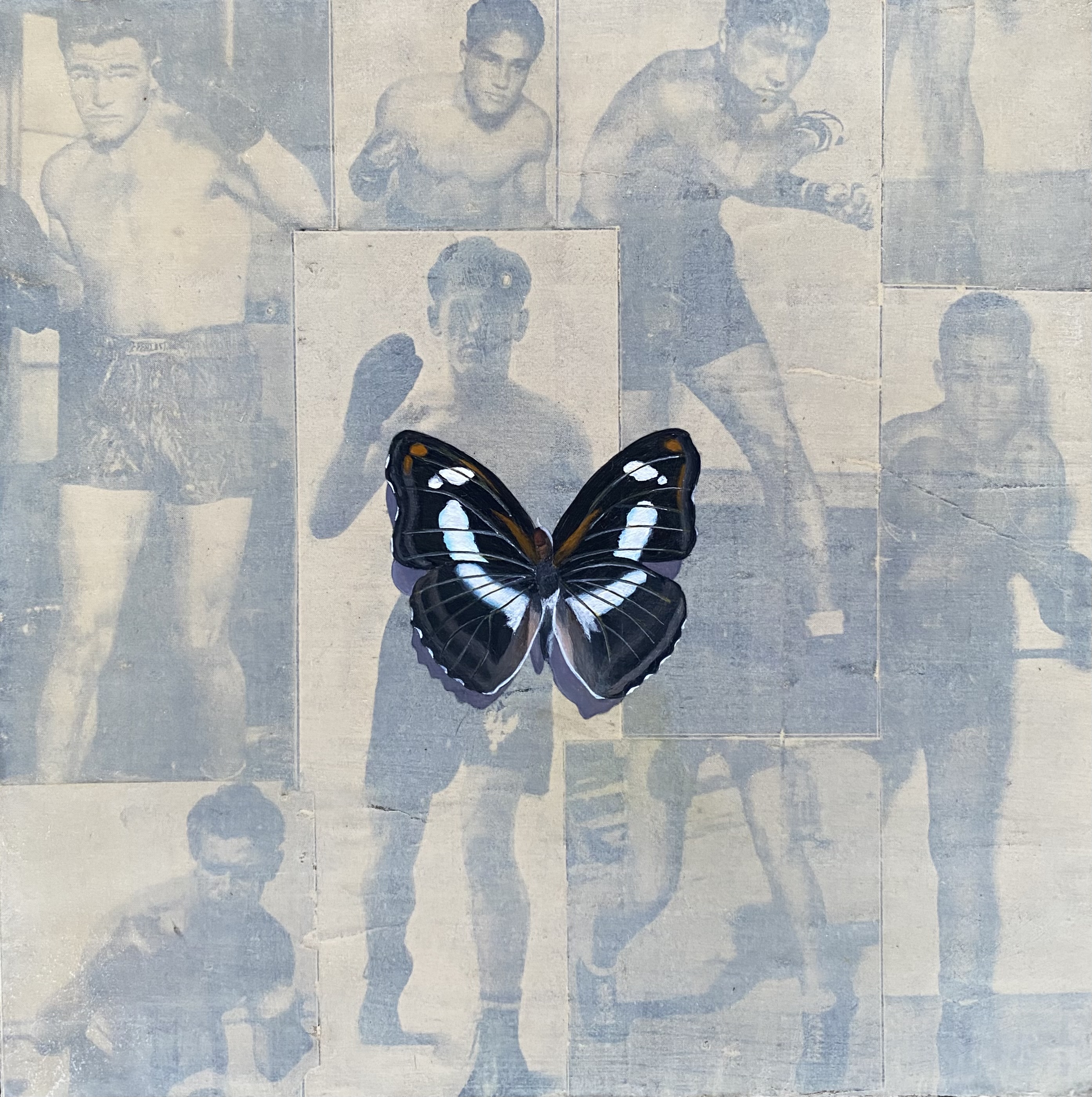 Your series, Float & Sting (which is on view at Make-it-Pop!), revolves around your love for the sport of boxing. How do you balance the roughness or powerful strength of boxing alongside the delicacy of butterflies within the same composition?