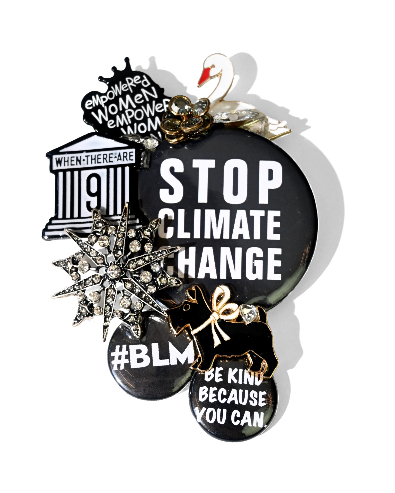 My hope is that viewers first covet the brooches because they are eye candy—Smiley faces! Bright colors! Sparkle! And then they notice and consider the messaging—Voting, LGBTQ+ rights, Black rights, Global warming, Science… Making a difference can start with a conversation, and these brooches are definitely conversation starters.