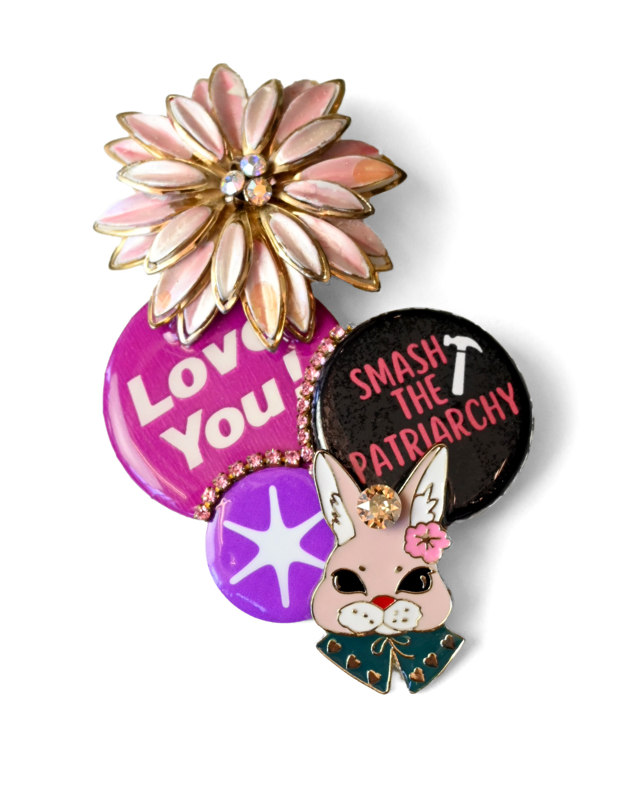 The brooches I created for Make-It-Pop! are mash-ups of pop-culture ephemera, protest messages, and bling-y jewels. They’re meant to be fun but also comment on the struggles, celebrations and excesses of modern life, as was also the case with the original pop art of the 60s.