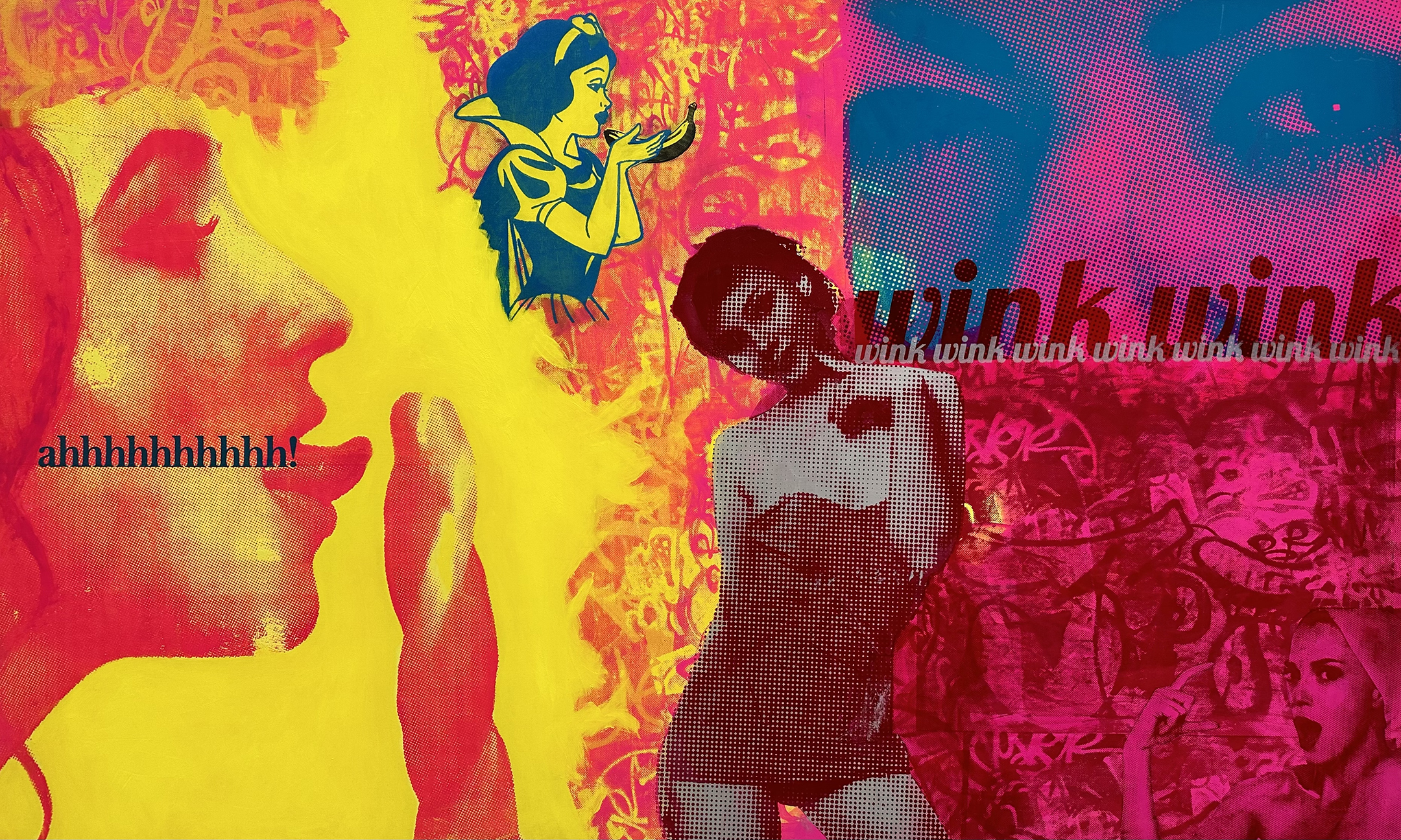 My hope is that viewers are initially drawn in by the bold color, pop imagery, and graphic layering, but then begin to recognize the deeper commentary underneath. I want the work to feel visually engaging, even playful at first, and then slowly reveal itself as more complex and confrontational. If someone walks away questioning those stereotypes or seeing something familiar in a new way, then the work has done what I intended. I also hope the overall feeling is empowering, because while the work critiques objectification, it’s equally about agency, resilience, and reclaiming identity.