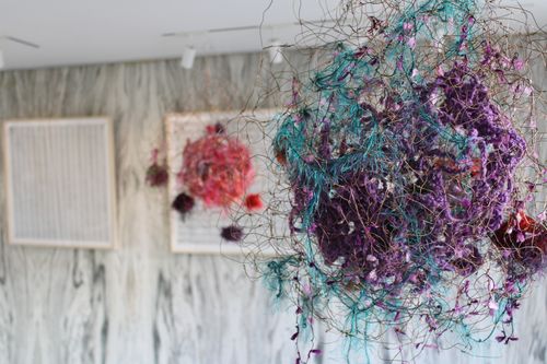 Anna Hendrick Karpatkin Benjamin, Nhi Vo, and Injoo Whang all revel in an almost faith-like ritual of making. Benjamin’s early inspiration from her religious faith has led her to abstract both the iconographies she grew up with as well as the practice of worship until all that remains is color, form, and surrender to a higher power of making. She, a mere mortal, produces the lines- but she cannot control the color that forms when they overlap. Likening her practice to meditation, Nhi Vo repeatedly, laboriously writes words at a mind-numbingly small scale. Her inscriptions in their sheer vastness, blur into each other, creating quiet, delicate patterns. There is purpose in the tediousness; perhaps with enough duplication, the word, or what it represents to her, can finally sink into her being and radiate back outwards. Injoo Whang’s works also employ multiples of the same forms, but in the many, slight differences start to emerge. The individualism of her tiles or blocks of marks, are only detectable because of the mass of the whole - the one could not be seen if not for the thousands.