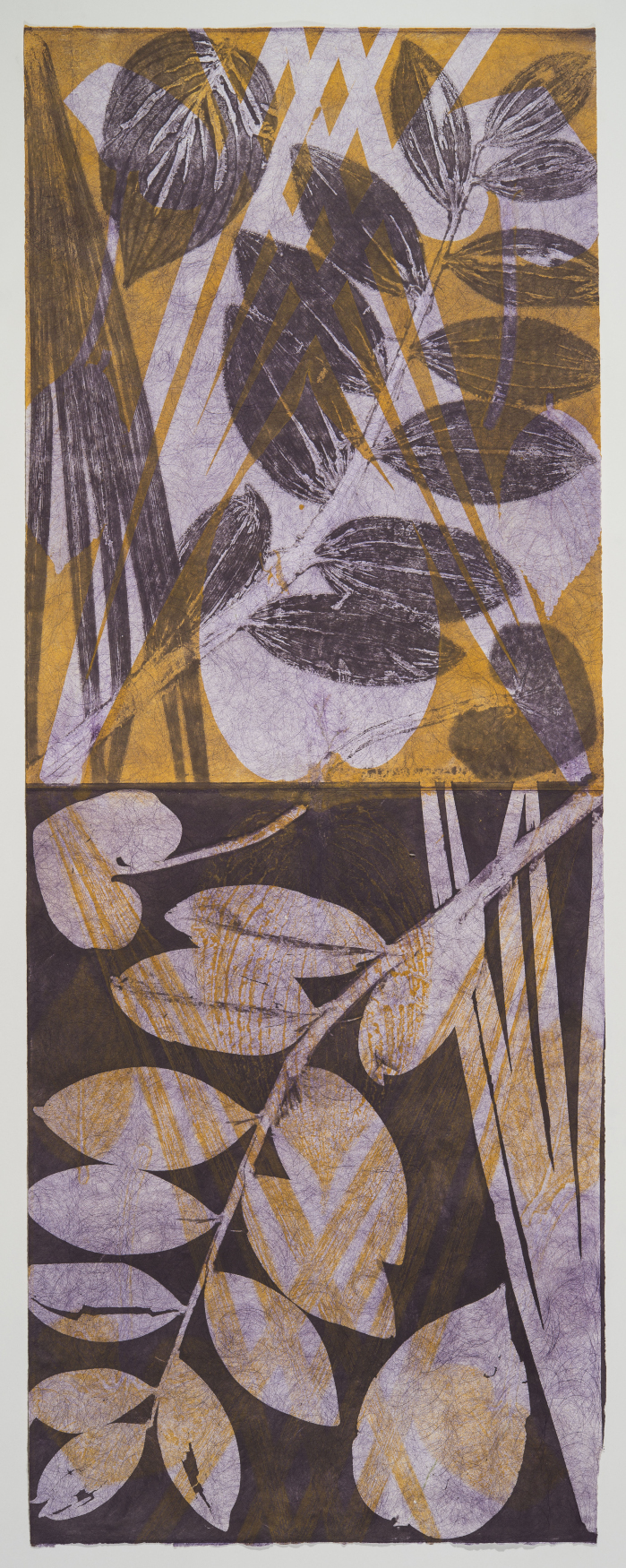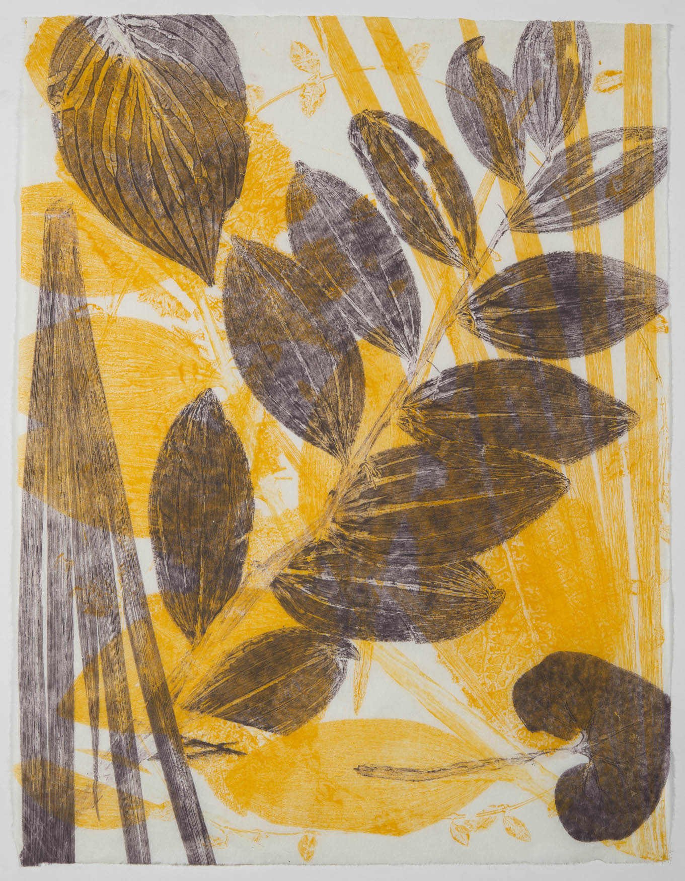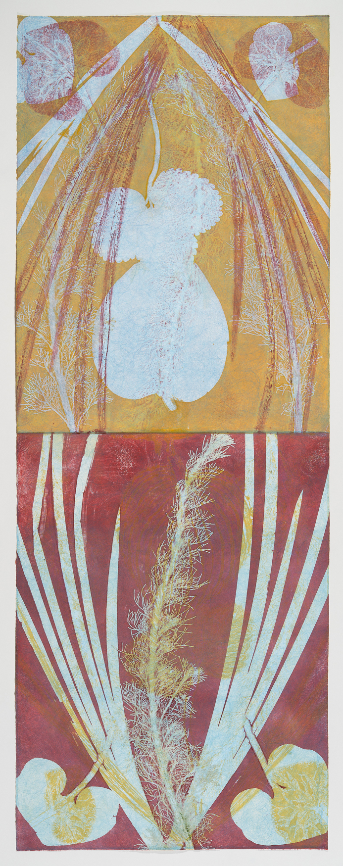 “I create monotypes in collaboration with the botanical world. The intricate structure and meditative energy of plants form the underlying matrix of the work. Leaves and stems collected from my garden are placed directly on the blank inked surface of a plate, creating stencils. I then remove the plants and run the plate again, printing the ghost image left by the leaves on the plate. Negative and positive shapes alternate, building layer upon layer, as the plant material embosses the paper. The “Reflection” series in particular explores this dialog of color in negative and positive forms, creating relationships of balanced contrast. The “Tara” series is a more free-form meditation on the same principles.”