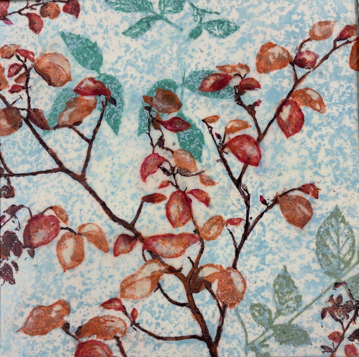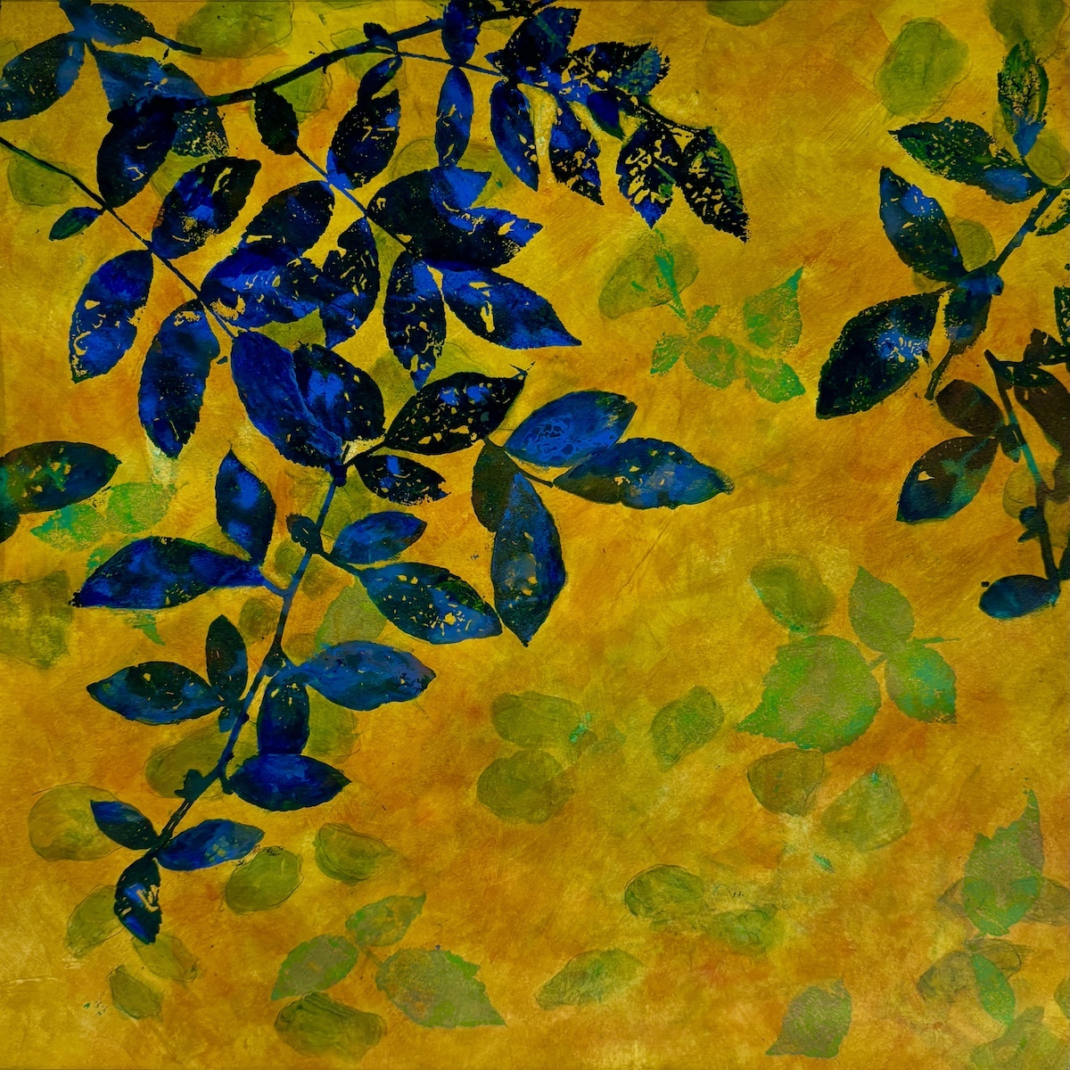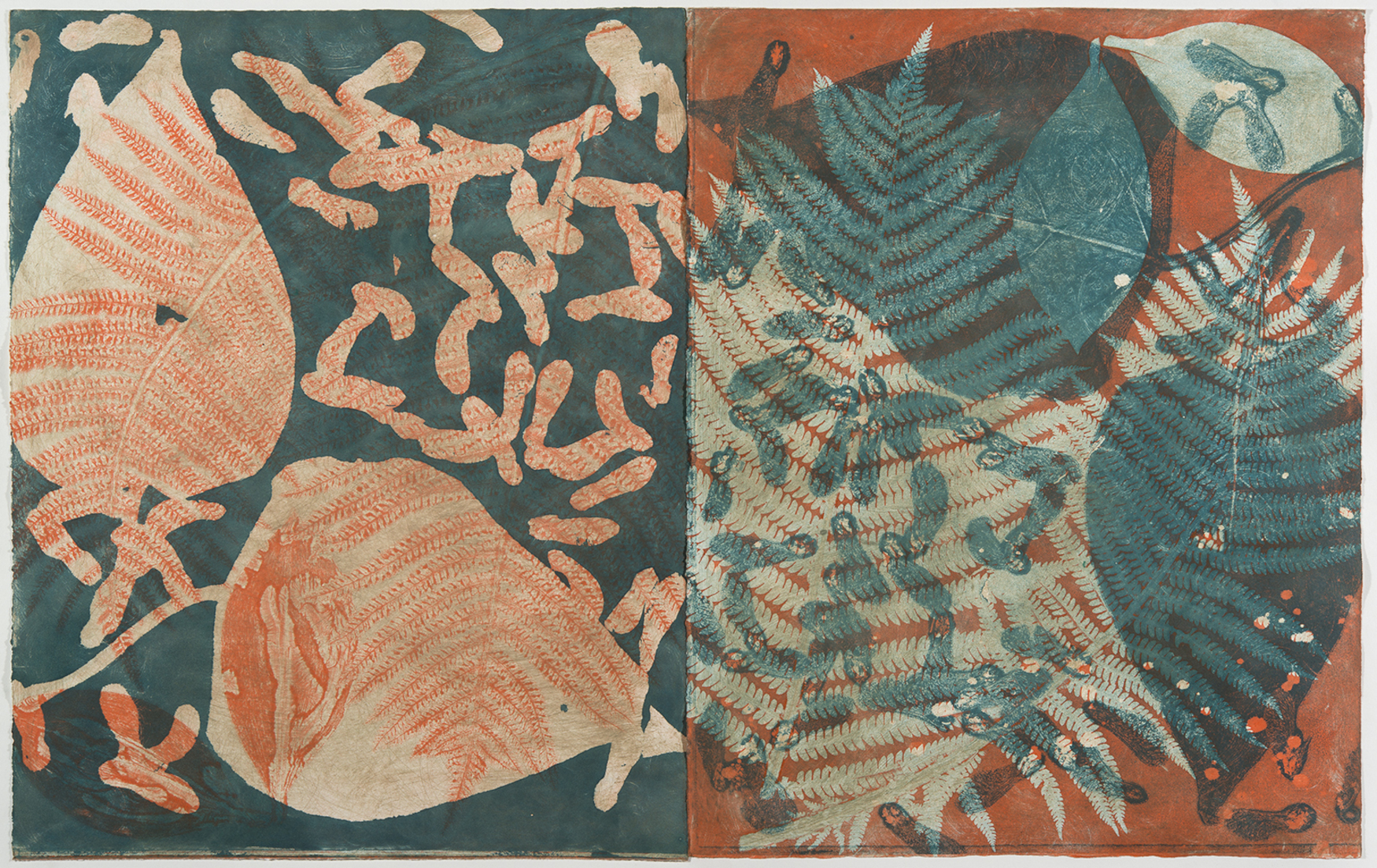 “I create monotypes in collaboration with the botanical world. The intricate structure and meditative energy of plants form the underlying matrix of the work. Leaves and stems collected from my garden are placed directly on the blank inked surface of a plate, creating stencils. I then remove the plants and run the plate again, printing the ghost image left by the leaves on the plate. Negative and positive shapes alternate, building layer upon layer, as the plant material embosses the paper. The “Reflection” series in particular explores this dialog of color in negative and positive forms, creating relationships of balanced contrast. The “Tara” series is a more free-form meditation on the same principles.”