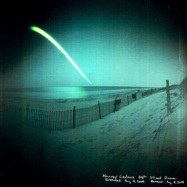 Macan utilizes the photographic technique Solargraphy, which captures the sun’s path across the sky over the course of a day with a pinhole camera. The long lingering from the eye of the camera shutter blurs out the quicker moments: cars zipping by, pedestrians crossing the street, or cyclists weaving in between the two. The aspects of life that change most slowly such as the sun are the only moments captured against the backdrop of what is most permanent in the city: buildings and bridges.
